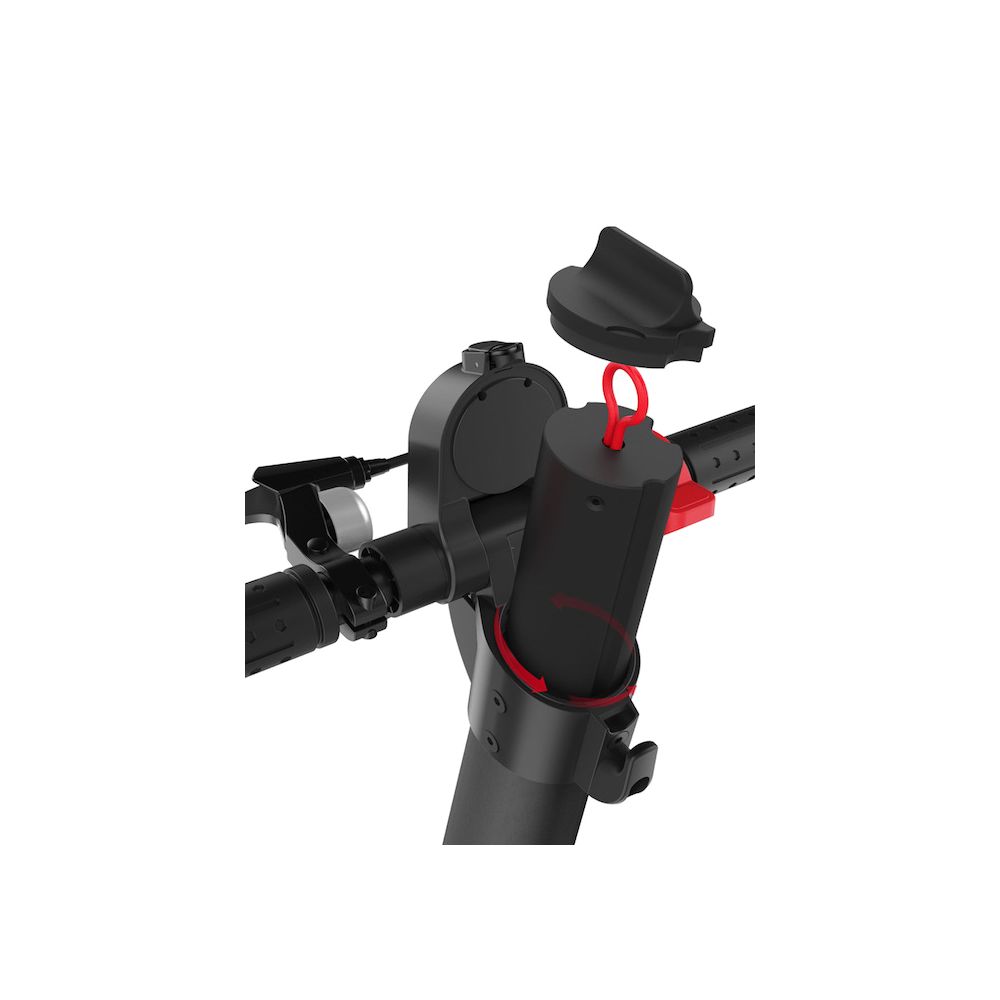 Baterija je izmenjiva i vrlo lako se menja kao baterija na fotoaparatu. Moze se poneti rezervna i vrlo brzo zameniti. Baterija se nalazi u vratu trotineta